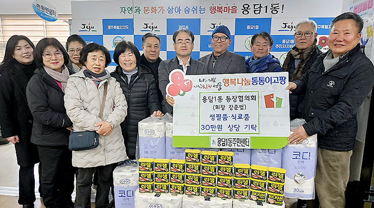 제주시 용담1동통장협의회(회장 강춘범)는 지난 20일 용담1동주민센터(동장 강재선)를 방문해 어려운 이웃을 위한 물품으로 화장지와 햄통조림 등 30만원 상당을 기탁했다. 이번에 기부된 물품은 용담1동주민센터 내 '통통이고팡'후원 창구에 비치될 예정이다.