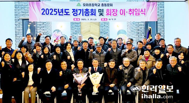 (제주시 오라초등학교 총동문회(회장 김상훈)는 지난 21일 제주시 소재 음식점에서 '2025년 정기총회 및 회장 이·취임식'을 가졌다.