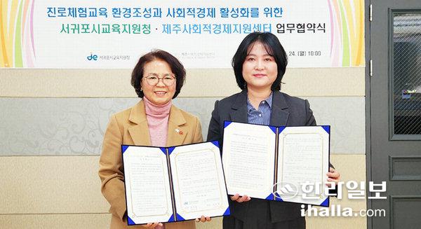 [한라일보]서귀포시교육지원청(교육장 강옥화)은 지난 24일 본 청사에서 제주도사회적경제지원센터(센터장 임현정)와 진로체험교육 환경조성과 사회적 경제 활성화를 위한 업무협약을 체결했다.