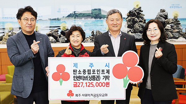 [한라일보] 제주시는 2023년도 탄소중립포인트제(에너지) 인센티브 미지급분 2712만5000원을 제주사회복지공동모금회(회장 강지언)에 26일 지정 기탁했다. 탄소중립포인트제는 가정, 상가에서 에너지 절약으로 온실가스를 줄이면 인센티브를 지급하는 제도인데, 이번 기탁금은 기부를 희망한 참여자와 거주지 이전·수취인 불명 등으로 지급하지 못한 인센티브를 모아 마련됐다.