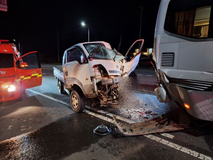 5일 오후 서귀포시 대정읍 도로에서 1t 트럭이 버스를 추돌해 트럭 운전자가 숨졌다. 제주도소방안전본부 제공