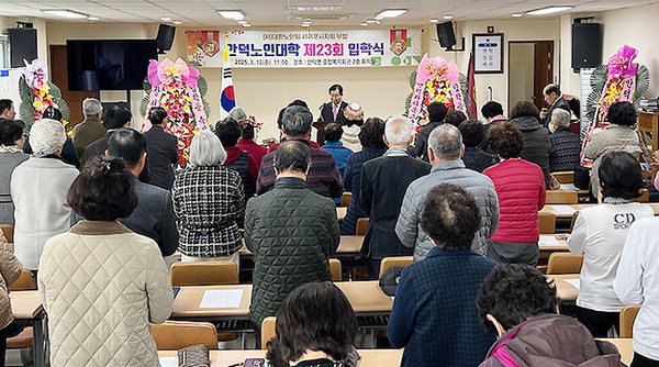 [한라일보] 대한노인회 서귀포시지회 부설 안덕노인대학(학장 강상인)은 지난 12일 안덕면종합복지회관에서 입학생 55명과 하성용 도의원, 지역 내 기관·단체장을 비롯한 지역주민 등 100여 명이 참석한 가운데 제23회 안덕노인대학 입학식을 개최했다.