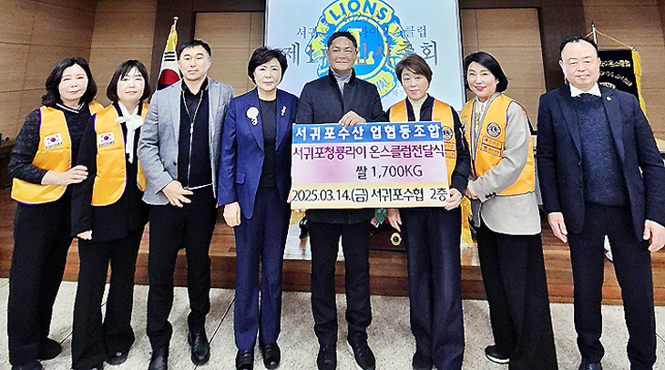 서귀포수산업협동조합(조합장 김미자)은 지난 14일 수협 2층 대강당에서 서귀포청룡라이온스클럽에 쌀 1700㎏을 기탁했다. 기탁한 쌀은 '2025년도 서귀포수협 풍어제' 때 기증받은 쌀화환이다.