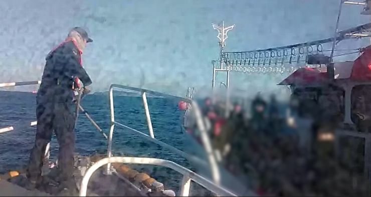 서귀포해경이 26일 가파도 인근 해상에서 침수된 낚시어선 승객을 구조하고 있다. 서귀포해경 제공