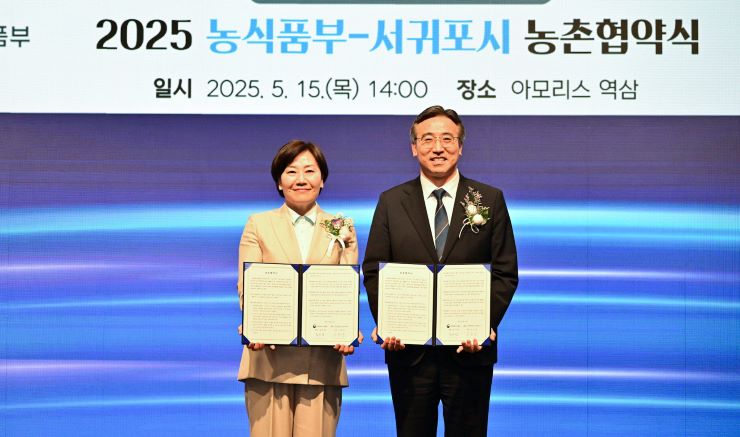 서귀포시는 15일 농림축산식품부와 농촌협약을 체결하고, 앞으로 5년 동안 농촌지역 정주여건 개선과 공동체 활성화 사업을 추진키로 했다. 송미령 농림축산식품부장관(왼쪽)과 오순문 서귀포시장. 서귀포시 제공