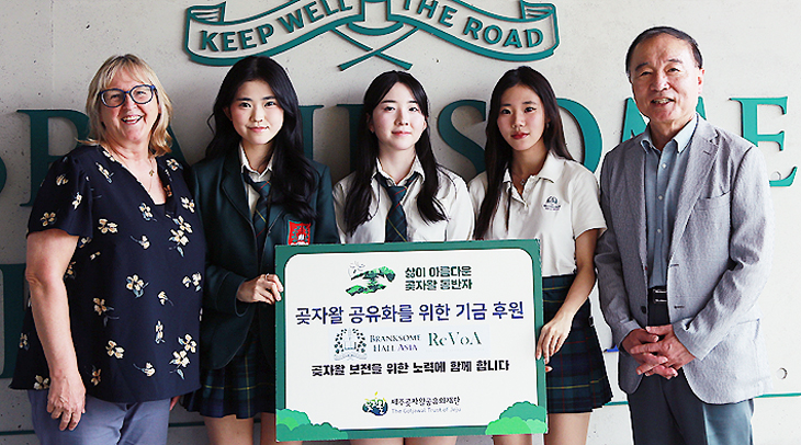 국제학교 브랭섬 홀 아시아(총교장 블레어 리 박사) 재학생들로 구성된 프로젝트 팀 '리보아'(ReVoA. 리더 정윤서·김윤서·장서연)는 지난달 30일 곶자왈 공유화 기금 100만원을 제주곶자왈공유화재단(이사장 김범훈)에 전달했다.