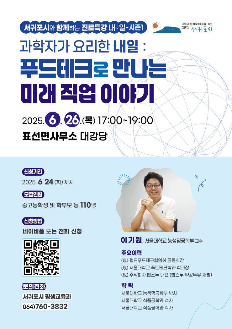 이달 26일에는 표선면사무소 대강당에서 서울대학교 농생명공학부 이기원 교수가 '과학자가 요리한 내일:푸드테크로 알아보는 미래 직업 이야기'를 주제로 강연할 예정이다. 인공지능(AI), 빅데이터 등 4차 산업혁명 기술을 식품산업에 접목한 푸드테크 산업을 소개하고, 이를 통해 청소년들이 미래 유망 산업을 기반으로 한 진로 방향을 설정할 수 있도록 돕는 시간을 마련할 계획이다.
