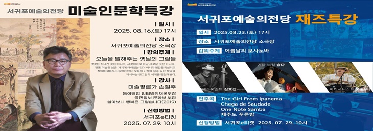 [한라일보] 서귀포시는 8~9월 서귀포예술의전당 소극장에서 '한여름밤 재즈토크 콘서트'와 '굿이브닝 인문예술 특강'을 진행한다. 시민들의 일상 속에서 쉽게 예술을 접할 수 있는 다양한 기회를 제공하기 위한 프로그램이다.