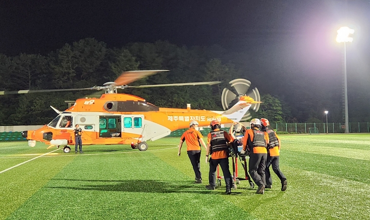 지난 6일 오후 8시 28분쯤 제주시 구좌읍 하도리의 한 축구장에서 심정지로 쓰러진 20대 남성이 소방의 신속한 구조로 의식을 회복했다. 제주소방안전본부 제공