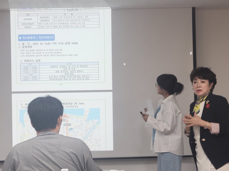 23일 오전 제주문화예술재단 회의실에서 열린 제64회 탐라문화제 기자간담회에서 김선영 제주예총 회장이 올해 탐라문화제 기본계획을 설명하고 있다. 박소정기자