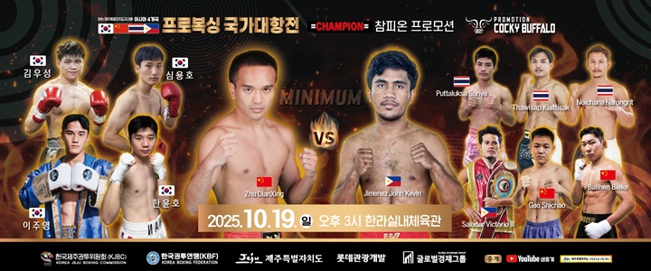 오는 19일 오후 3시부터 제주종합경기장 한라체육관에서 (사)한국제주권투위원회(KJBC) 주관으로 열리는 이번 대회에는 IBF와 WBC 미니멈급 세계 타이틀 매치의 전초전으로 마련된 10라운드 경기가 각각 1게임씩 열리는 등 총 6경기가 펼쳐진다.