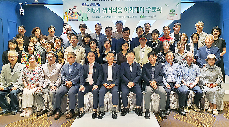 (사)제주생명의숲(이사장 고윤권)은 지난 14일 하니크라운호텔 연회장에서 4월 1일부터 9월 30일까지 제6기 생명의숲 아카데미 과정을 마친 수료생 45명과 동문회, 산림가족 등 내빈이 참석한 가운데 수료식을 개최했다.