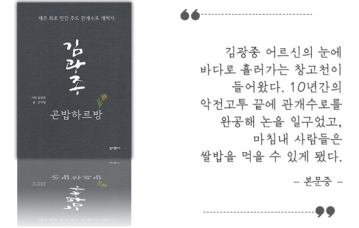 그만큼 과거에는 쌀밥을 뜻하는 제주어인 '곤밥'이 귀하디귀한 소망 그 자체였다. 이 꿈같은 '곤밥'을 현실로 만들어준 한 어르신의 일대기가 책으로 탄생했다. 제주 최초의 민간 주도 관개수로 개척자, 김광종(1792~1879) 어르신이다.