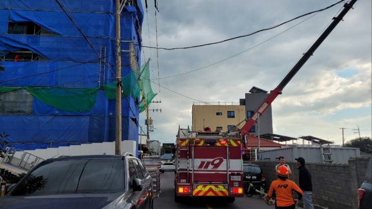 31일 오전 공사장에서 작업하던 크레인이 전신주 고압선을 건드려 제주시 외도·내도·이호동 일대 1100여가구에 대한 정전 사태가 발생했다. 제주도소방안전본부 제공