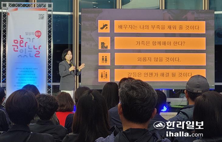 지난 30일 오후 서귀포시 서호동 서귀포혁신도시 내 국토교통인재개발원 로비에서 '2025 문화가 있는 날-구석구석 문화배달' 10월 프로그램으로 열린 '로비가 강연장'에서 소통전문가 김지윤 유스토리연구소 소장이 강연하고 있다. 박소정기자