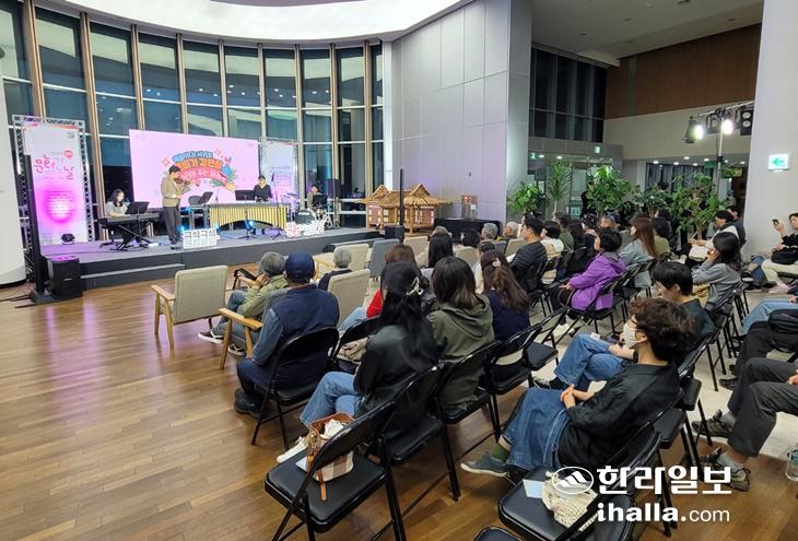 지난 30일 오후 서귀포시 서호동 서귀포혁신도시 내 국토교통인재개발원 로비에서 '2025 문화가 있는 날-구석구석 문화배달' 10월 프로그램으로 열린'로비가 강연장'에서 강연에 앞서 클래식 타악기를 기반으로 한 도내 청년 예술단체인 '단추프로젝트'이 연주하고 있다. 박소정기자