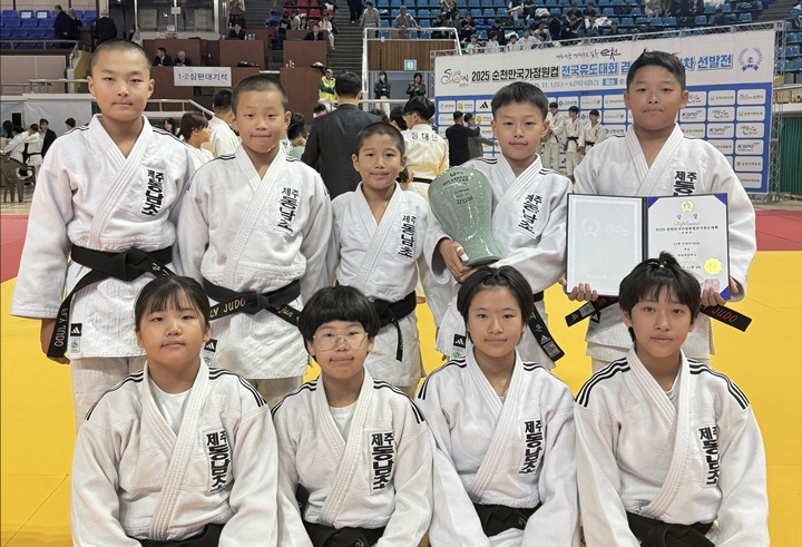 2025 순천만국가정원컵 유도대회에서 남자초등부 단체전 우승을 차지한 동남초등학교 선수단.