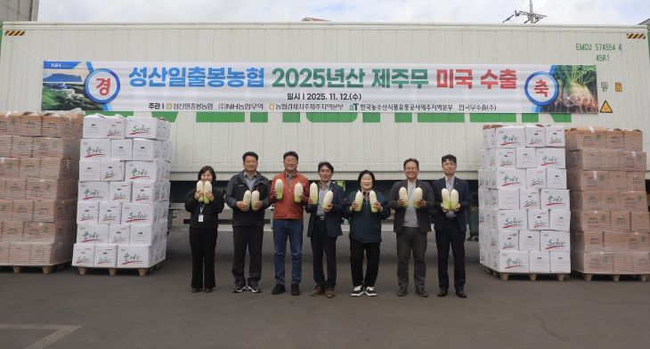 제주 성산일출봉농협은 12~13일 이틀간 농산물산지유통센터에서 2025년산 제주 겨울무의 대미((對美) 수출 첫 선적작업을 실시했다. 12일 40t 규모에 이어 13일 40t을 추가로 출하해 양일간 총 80t의 제주 겨울무를 미국으로 보냈다.