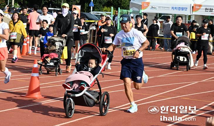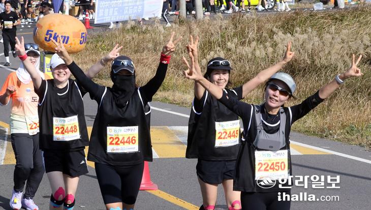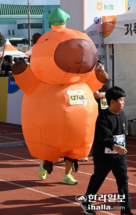 특히 10㎞, 5㎞ 코스에선 어린 아이를 유모차에 태워 함께 달리는 가족 단위 참가자들이 많았다. 40대 양현지 씨(제주시 화북)는 "러닝을 시작한 지 1년 정도 안 됐는데, 가족과 함께 추억을 만들고 싶어 온가족이 참여하게 됐다"고 전했다. 또 자녀와 함께 달리는 가족 단위 참가자들을 비롯해 감귤 모자를 쓰고 달리는 사람들, 자신만의 스타일로 옷을 만들어 입은 사람들 등 참가자들의 모습도 다양했다.