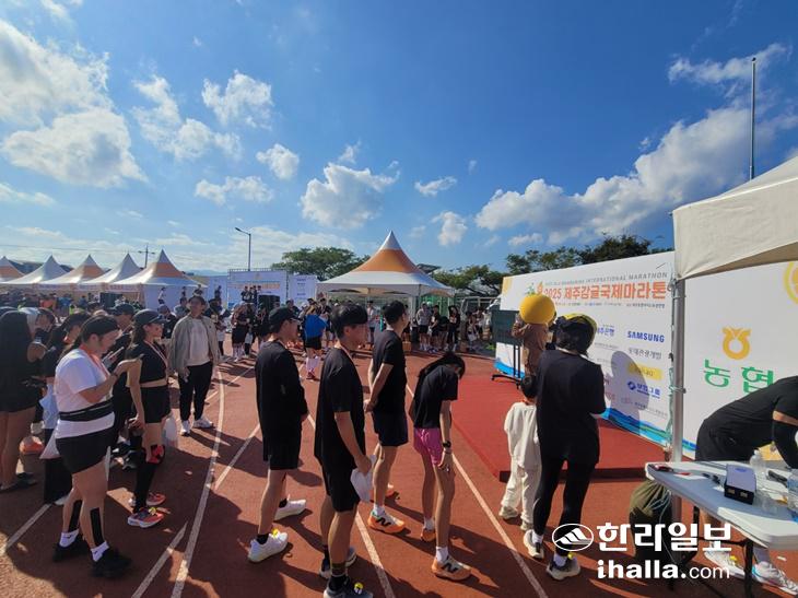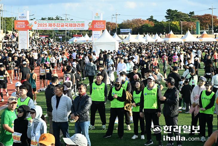 [한라일보] 16일 오전 '2025 제주감귤국제마라톤대회'의 출발점인 제주시 조천운동장. 이른 아침부터 속속 모여든 국내외 달림이들로 운동장은 출발 1시간여 전부터 가득찼다. 맑은 하늘 아래 완연한 가을 날씨를 마주한 참가자들은 "날씨 너무 좋다"라는 말을 하며 설렌 표정으로 레이스를 나설 준비를 했다.