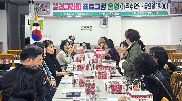 서귀포시 서홍동마을회(회장 강성극)는 지난 19일 서홍동복지회관에서 지역주민 20여 명이 참여한 가운데 캘리그래피 프로그램을 개강했다.