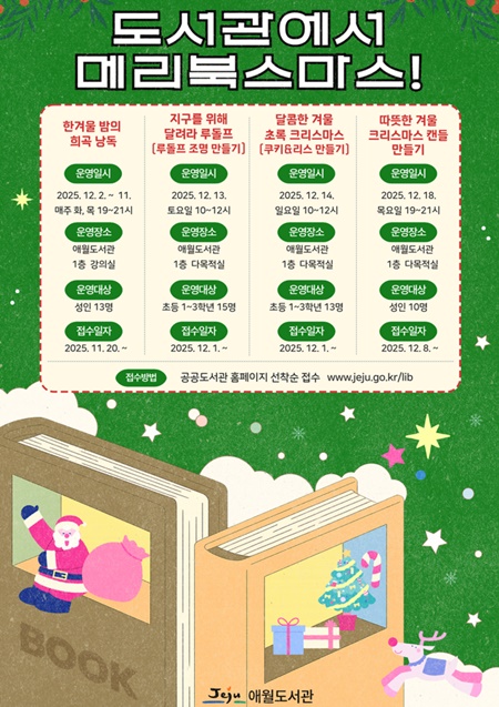제주시 애월도서관은 오는 12월 2일부터 18일까지 도서관 강의실과 다목적실에서 겨울 연말 특별 프로그램 '도서관에서 메리북스마스!'을 운영한다.