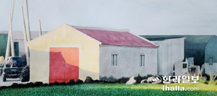 오후 5시가 넘어선 마을 안 풍경이다. 규모가 큰 농사를 많이 하는 주민들이 많아서일까 가장 보편적인 삶의 모습을 이 화면에 담았다. 정주공간 안에 있는 밭과 창고, 그리고 주변 정황들. 무엇보다 감동적인 것은 수평선 가까이 내려가는 햇살의 각도가 발생시킨 물상들의 색채변화다. 무미건조할 것 같은 평범한 풍광에 놀라운 변화와 회화적 깊이를 증폭시키는 매력적인 상황이 평이한 구도 속에서 아름다움을 뿜어낸다. 오래돼서 탈색된 빨간 지붕과 벽, 철문의 색을 마늘밭이 보색대비를 이루면서 시각적 도드라짐을 발생시킨다. 왼쪽 모퉁이 길가에 서있는 작은 트럭이 누구의 것인 지 짐작이 갈 차광망으로 감싼 농업시설물과 기울어진 각도에서 비치는 노란 성향의 광선을 받은 밭의 색채 변화가 너무나도 정겨워 그리게 된 것이다.