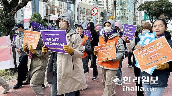 [한라일보] 제주여성인권상담소·시설협의회(회장 양금선)는 지난 25일 여성폭력 추방주간(11.25.~12.1.)을 맞아 제주 드림타워 복합리조트 분수대 광장 일대에서 폭력예방 홍보 캠페인 '폭력 OUT! 함께 CHANGE!'를 개최했다.