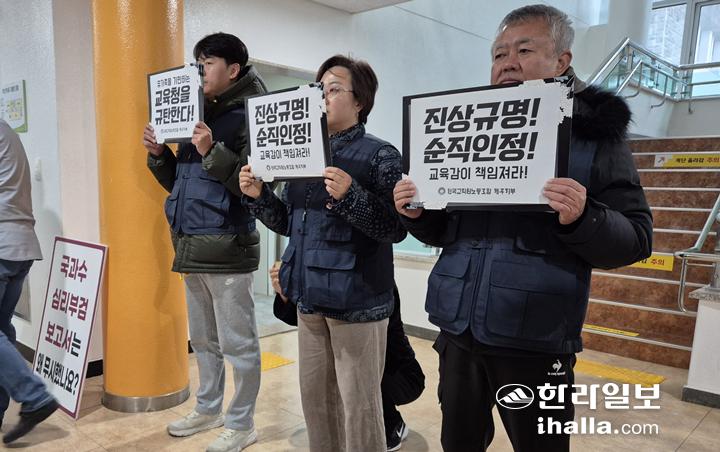 한편, 이날 브리핑장에서는 교원단체의 반발도 이어졌다. 전교조 제주지부는 '교육청을 규탄한다' 등의 문구가 적힌 피켓을 들고 교육청의 조사 방식과 결과 공개 절차를 비판했다. 현경윤 전교조 제주지부장은 "유족에게 사전 설명도 없이 일방적으로 결과보고 일정을 잡았다"며 "진상조사 결과를 신뢰하기 어렵다"고 말했다.