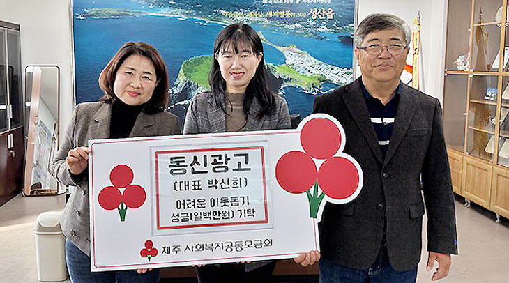 동신광고기획(대표 박신희)은 지난 2일 서귀포시 성산읍(읍장 김경범)을 방문, 지역사회의 소외되고 취약한 이웃을 위해 써달라며 성금 100만원을 기탁했다.