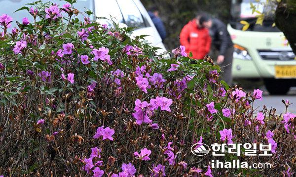 [한라일보] 4일 제주시 조천읍 교래리 산굼부리 진입로에 진달래꽃이 피어 행인들의 시선을 사로잡았다. 강희만기자