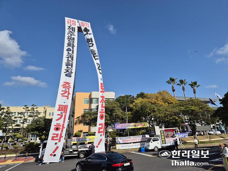 제주자치도청 앞에서 벌어지고 있는 제주평화인권헌장 선포 반대 시위.
