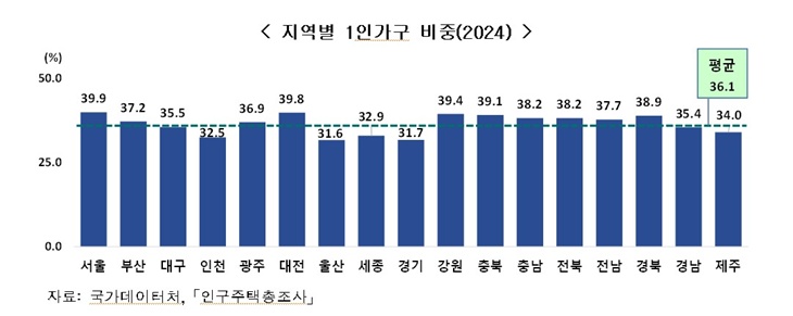 지역별로 1인 가구가 차지하는 비중은 서울이 39.9%로 가장 높았다. 다음으로 대전(39.8%), 강원(39.4%), 충북(39.1%), 경북(38.9%)이 뒤를 이었다.