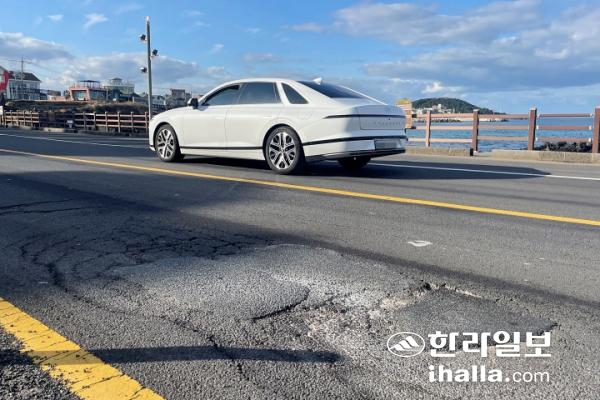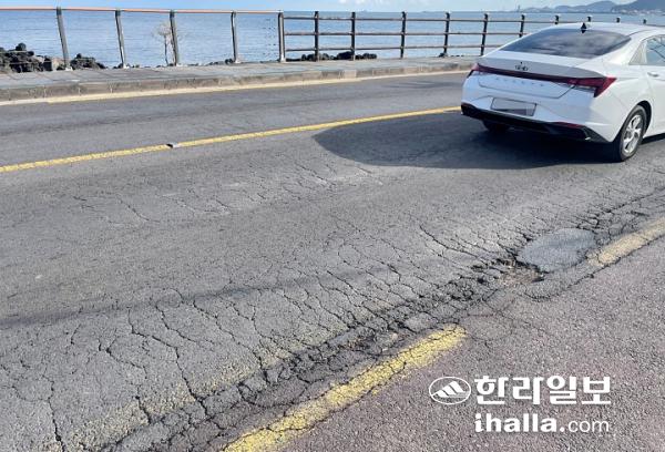 16일 오전 제주시 용담 해안도로. 도로 곳곳에서 포트홀과 균열, 지반 침하 등이 발생해 운전자들의 불편이 잇따르고 있다. 양유리기자