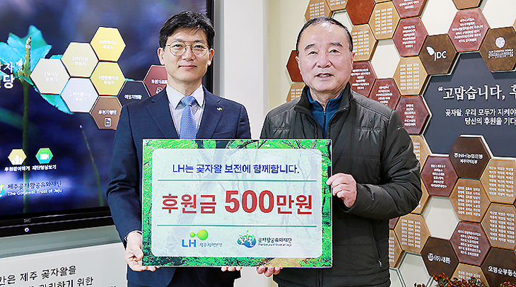 LH제주지역본부(본부장 문정만)는 17일 제주곶자왈공유화재단(이사장 김범훈)에 곶자왈 공유화 기금 500만원을 전달했다.