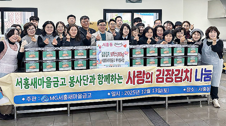 서홍새마을금고(이사장 문순용)는 지난 13일 서귀포시 서홍동복지회관에서 임직원 10명과 금고 봉사단(단장 김연자) 30명이 참석한 가운데 김치 350㎏을 후원했다.