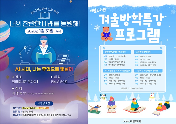 제주시 애월도서관은 초등학생을 대상으로 한 겨울방학 특강 프로그램을 이달 21일부터 다음달 1일까지 운영한다. 책 읽기·놀이·만들기 활동을 결합한 참여형 문화·독서 프로그램을 준비했다.