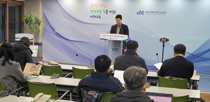 강재훈 제주도교육청 감사관이 27일 도교육청 기자실에서 숨진 제주 교사 순직 인정과 관련해 브리핑을 하고 있다. 박소정기자