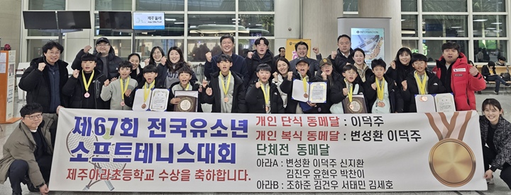 제67회 유소년 전국소프트테니스대회에서 동메달 4개를 획득한 아라초 선수단.