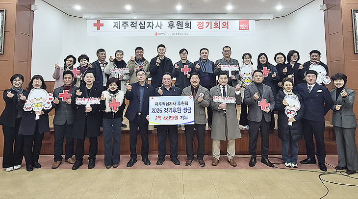 [한라일보] 제주적십자사 후원회(회장 정영진)는 최근 대한적십자사 제주특별자치도지사(회장 정태근)에서 열린 '후원회 1월 정기회의'에 참석해 2025년 정기후원 성금 2억4000만원 전달식을 가졌다.