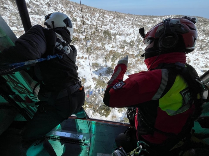 119구급대원들이 지난 29일 오전 한라산 성판악 코스에서 심정지로 쓰러진 50대 남성 A씨 구조를 위해 헬기에 착륙하는 모습. 제주소방안전본부 제공