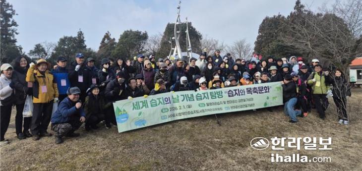 지난 1일 서귀포시 남원읍 수망리 물영아리오름 일대에서 열린 세계 습지의 날 기념 습지 탐방에서 참가자들이 기념 사진을 찍고 있다. 서귀포시 협약인증습지도시등 지역관리위원회 제공
