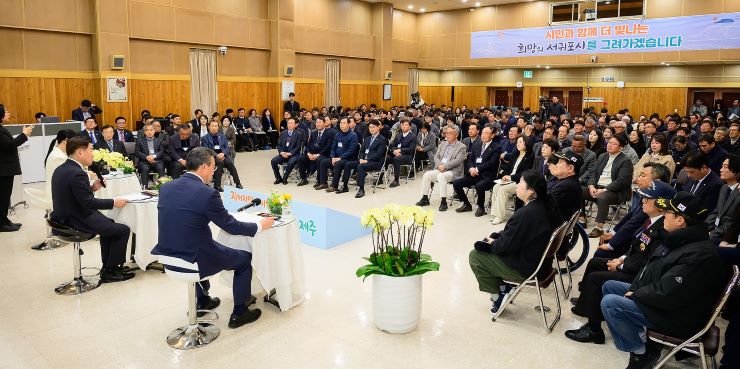 시민들은 또 서귀포시 지역의 사회적경제 활성화를 위한 종합 지원대책, 중장년과 노인 일자리 확충, 장애인 체육시설 확충, 원도심 빈건물 활용방안 등을 오 지사에게 건의했다.