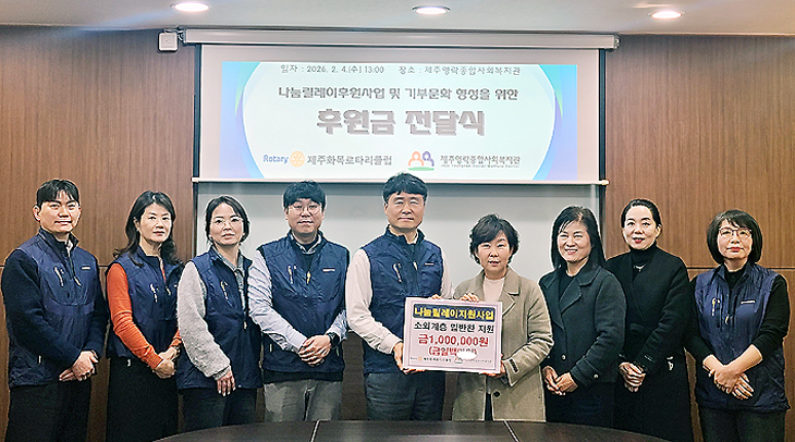 제주화목로타리클럽(회장 오영희)은 지난 4일 제주영락종합사회복지관(관장 강영수)의 소외계층 밑반찬지원사업을 위해 100만원을 후원했다.