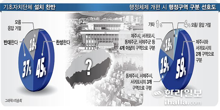 도민 1015명을 상대로 현재 단일 광역자치단체 체제로 운영되는 제주도에 시·군과 같은 기초자치단체를 두는 행정체제 개편에 대해 의견을 물은 결과 찬성 45%, 반대 37%로 오차범위(±3.1%) 밖에서 찬성 의견이 더 많았다. 답변을 거절하거나 모른다고 답한 비율은 18%다.