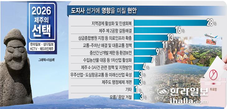 이번 제주도지사 선거에 영향을 미칠 가장 중요 현안이 무엇이라고 생각하는지 물은 결과 '지역 경제 활성화와 민생 경제 회복'을 꼽은 응답이 전체의 28%를 차지해 가장 많았다.