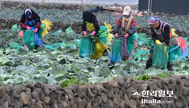 [한라일보] 11일 제주시 한림읍 수원리 농경지에서 농민들이 양배추 수확 작업을 하고 있다. 강희만기자