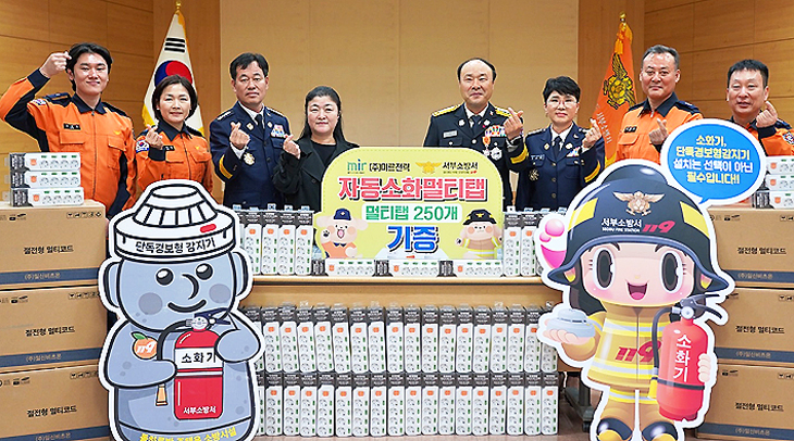 제주서부소방서(서장 고행수)와 미르전력(대표 김미형), 최운철 제주특별자치도 의용소방대 연합회 남성회장은 12일 도서지역 화재예방을 위한 전기화재 자동소화 멀티탭 250개 기증식을 가졌다.
