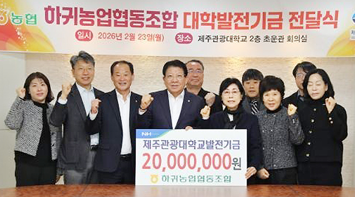 하귀농협(조합장 강병진)은 지난 23일 제주관광대학교(총장 김성규)를 방문해 지역사회에 기여할 인재 양성을 위해 사용해 달라며 발전기금 2000만원을 기탁했다.