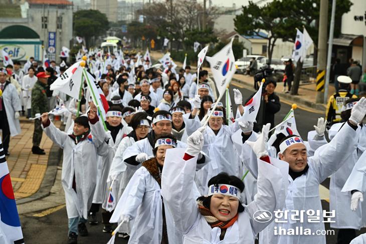 제106주년 3·1절을 기념해 제주시 조천읍 조천만세동산 일원에서 열린 만세대행진 재현 행사. 강희만기자
